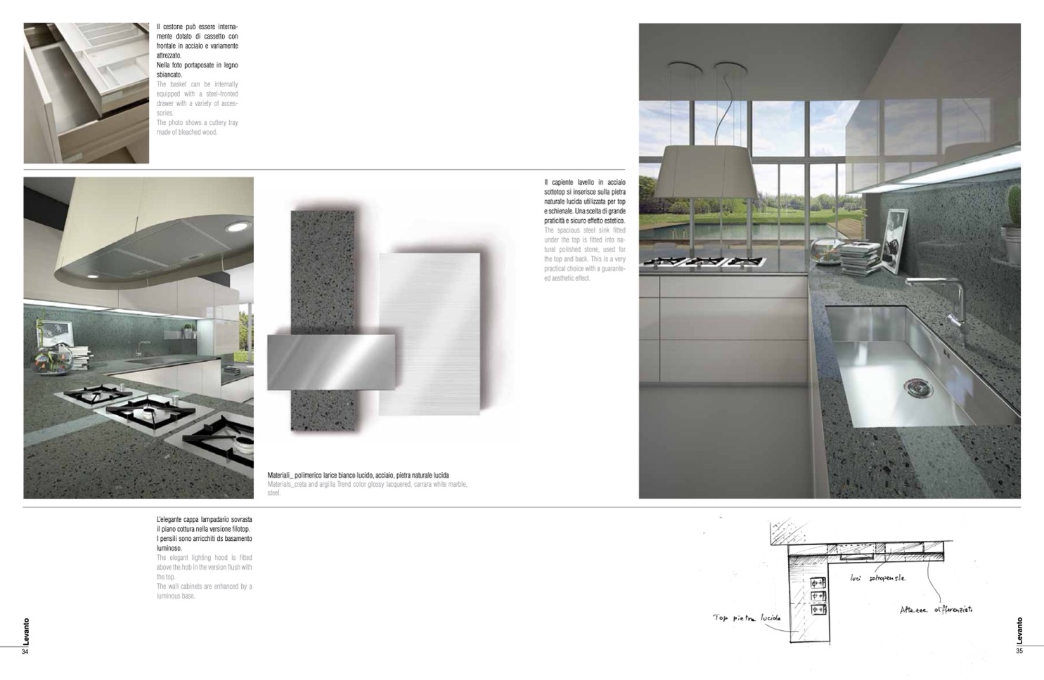 Materiali_ polimerico larice bianco lucido, acciaio, pietra naturale lucida