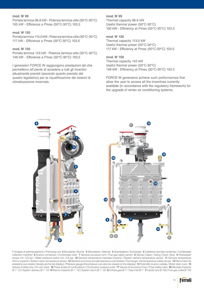 Valvola di sfiato aria / Air vent valve 16 Presa analisi di combustione / Combustion analysis outlet 17 Valvola di sicurezza 6 bar / 6 bar safety valve M Mandata impianto