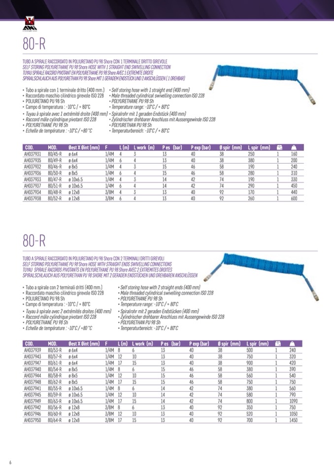 SELF STORING POLYURETHANE PU 98 Shore HOSE WITH STRAIGHT ENDS SWIVELLING CONNECTIONS