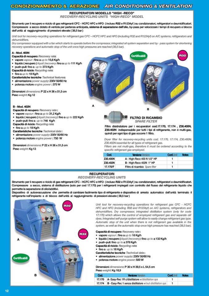 Strumento per il recupero e riciclo di gas refrigeranti CFC - HCFC HFC e HFO ( incluso R32 e R1234yf ) su condizionatori, refrigeratori e deumidificatori.