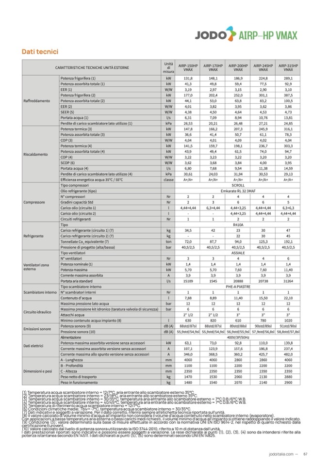 (1) Temperatura acqua scambiatore interno = 12/7°C, aria entrante allo scambiatore esterno 35°C.