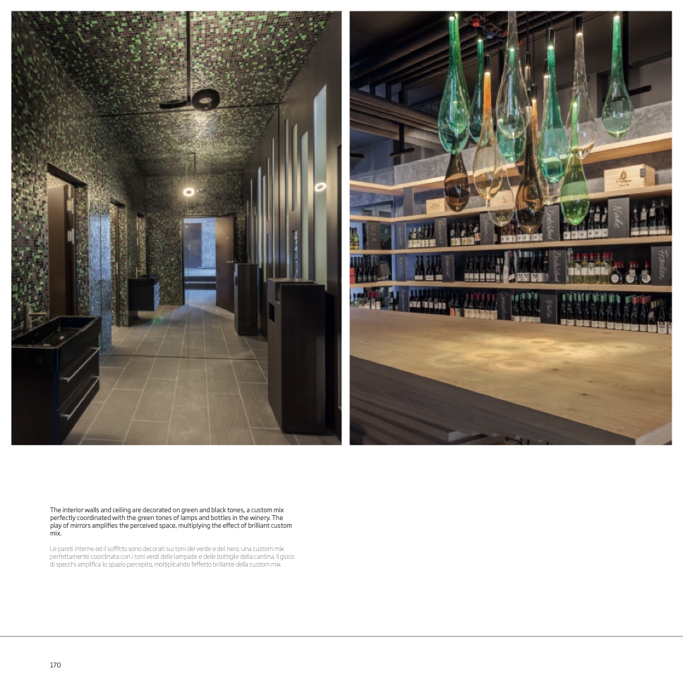 perfectly coordinated with the green tones of lamps and bottles in the winery. The