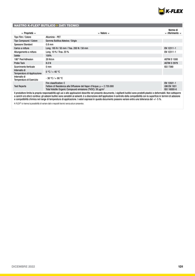 e compatibilità chimica nel range di temperatura di applicazione. I valori espressi in questo documento possono variare entro una tolleranza del +/- 5 %.