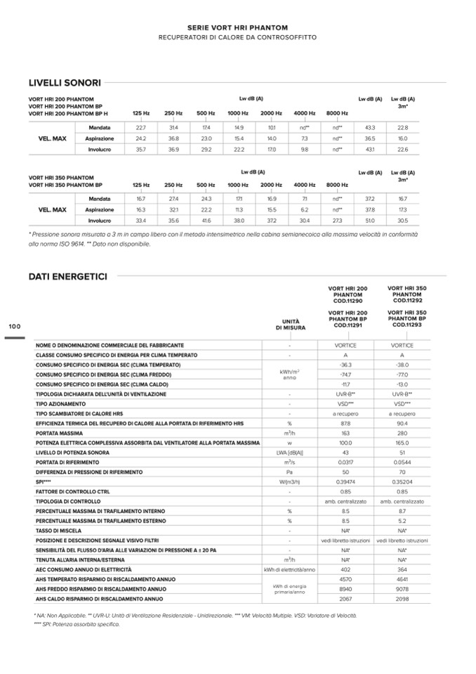 * NA: Non Applicabile. ** UVR-U: Unità di Ventilazione Residenziale - Unidirezionale. *** VM: Velocità Multiple. VSD: Variatore di Velocità.