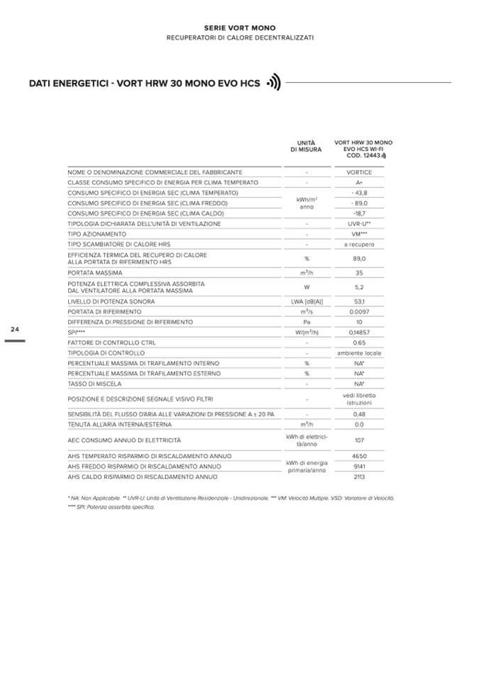 * NA: Non Applicabile. ** UVR-U: Unità di Ventilazione Residenziale - Unidirezionale. *** VM: Velocità Multiple. VSD: Variatore di Velocità.