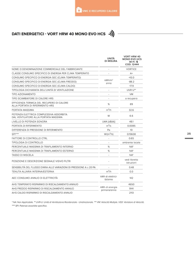 * NA: Non Applicabile. ** UVR-U: Unità di Ventilazione Residenziale - Unidirezionale. *** VM: Velocità Multiple. VSD: Variatore di Velocità.