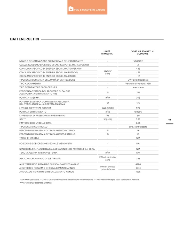* NA: Non Applicabile. ** UVR-U: Unità di Ventilazione Residenziale - Unidirezionale. *** VM: Velocità Multiple. VSD: Variatore di Velocità.