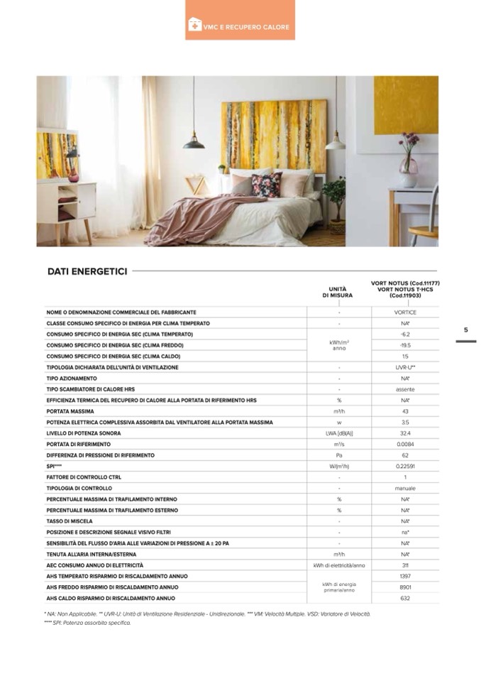 * NA: Non Applicabile. ** UVR-U: Unità di Ventilazione Residenziale - Unidirezionale. *** VM: Velocità Multiple. VSD: Variatore di Velocit