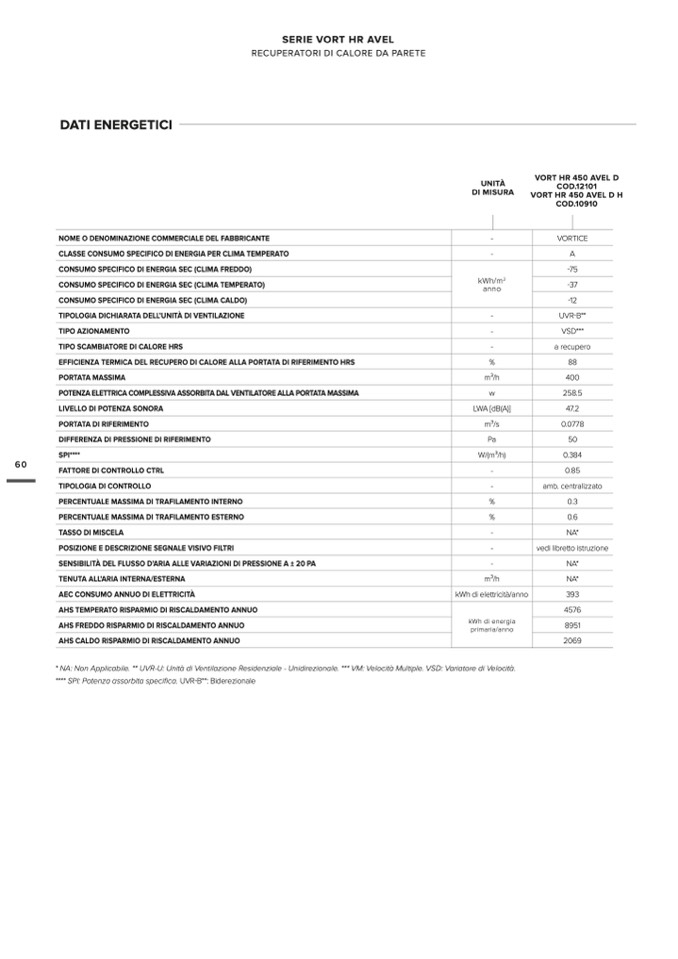 * NA: Non Applicabile. ** UVR-U: Unità di Ventilazione Residenziale - Unidirezionale. *** VM: Velocità Multiple. VSD: Variatore di Velocità.