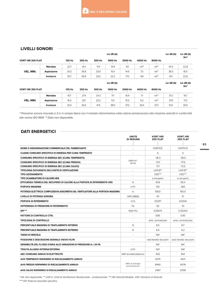 * NA: Non Applicabile. ** UVR-U: Unità di Ventilazione Residenziale - Unidirezionale. *** VM: Velocità Multiple. VSD: Variatore di Velocit