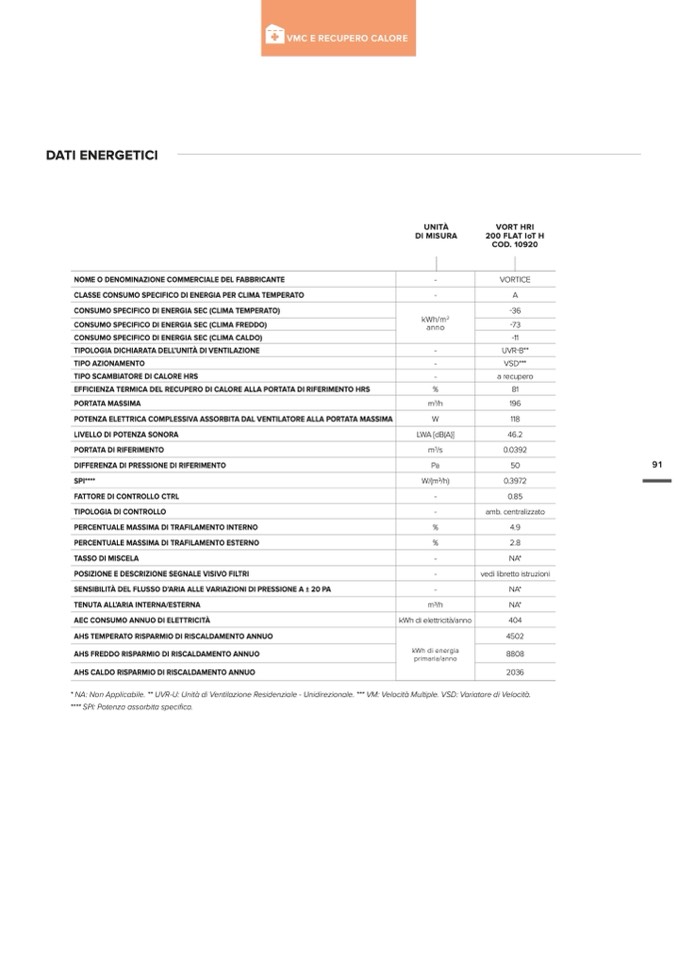 * NA: Non Applicabile. ** UVR-U: Unità di Ventilazione Residenziale - Unidirezionale. *** VM: Velocità Multiple. VSD: Variatore di Velocità.