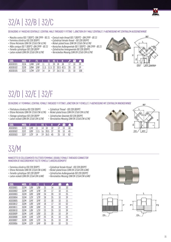 DEVIAZIONE A Y FEMMINA | CENTRAL FEMALE THREADED Y FITTING | JONCTION EN Y FEMELLE | Y-ABZWEIGUNG MIT ZENTRALEM INNENGEWINDE