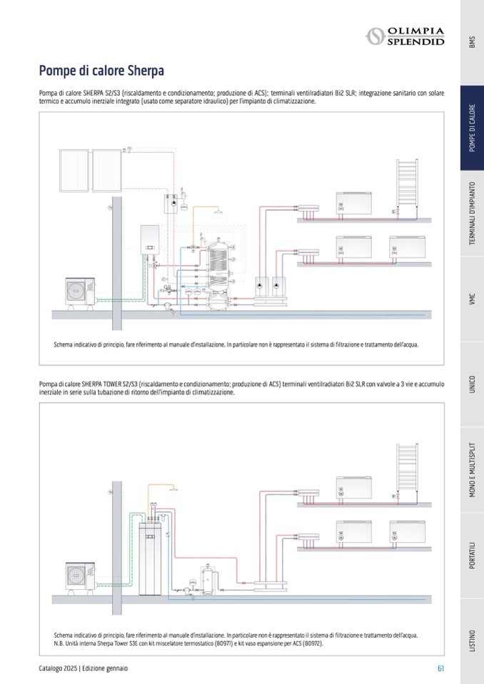 Pompa di calore SHERPA S2/S3 (riscaldamento e condizionamento; produzione di ACS); terminali ventilradiatori Bi2 SLR; integrazione sanitario con solare