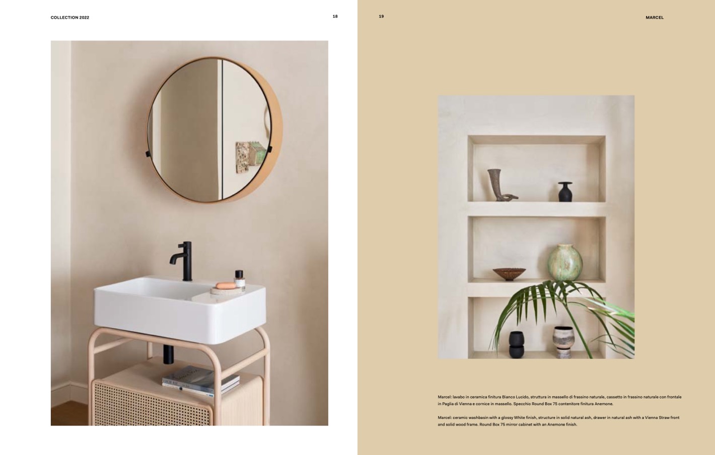 Marcel: ceramic washbasin with a glossy White finish, structure in solid natural ash, drawer in natural ash with a Vienna Straw front