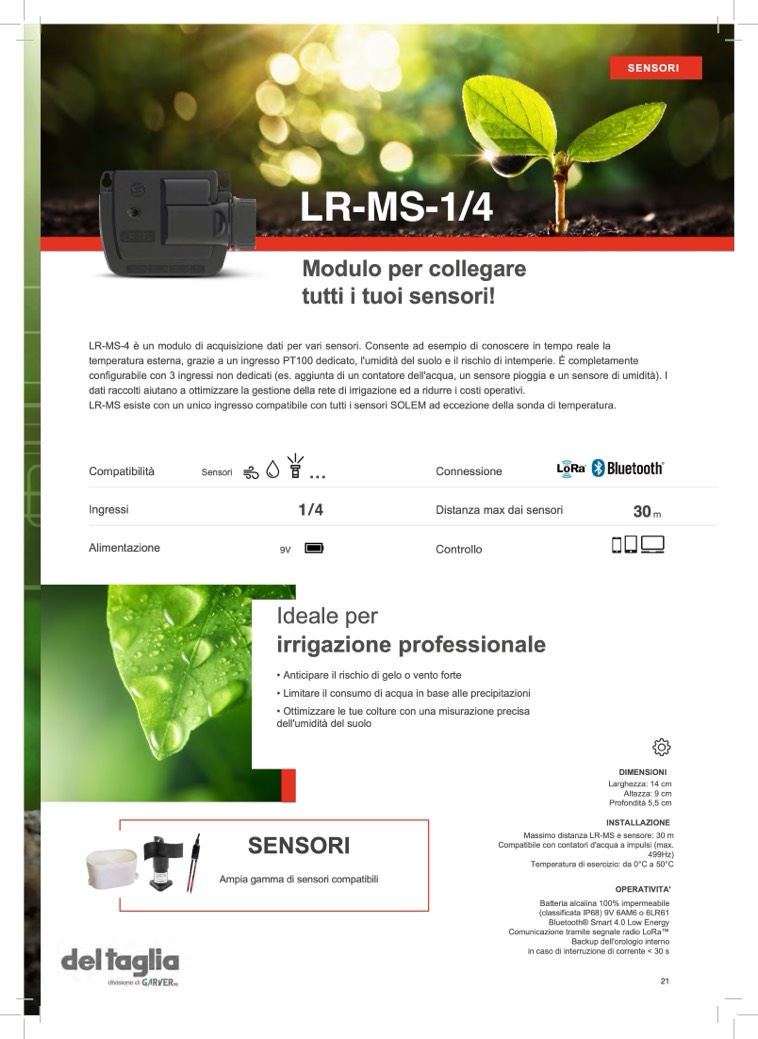 LR-MS esiste con un unico ingresso compatibile con tutti i sensori SOLEM ad eccezione della sonda di temperatura.