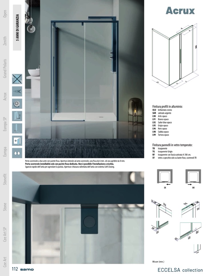 Porta scorrevole a due ante con parete fissa. Apertura laterale ad anta scorrevole, una fissa da 6 mm. ed una apribile da 8 mm.