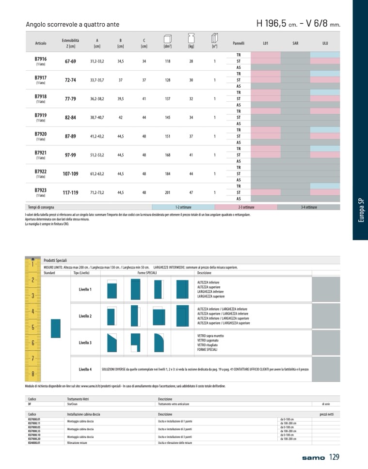 I valori della tabella prezzi si riferiscono ad un singolo lato: sommare l'importo dei due codici con la misura desiderata per ottenere il prezzo totale di un box angolare quadrato o rettangolare.