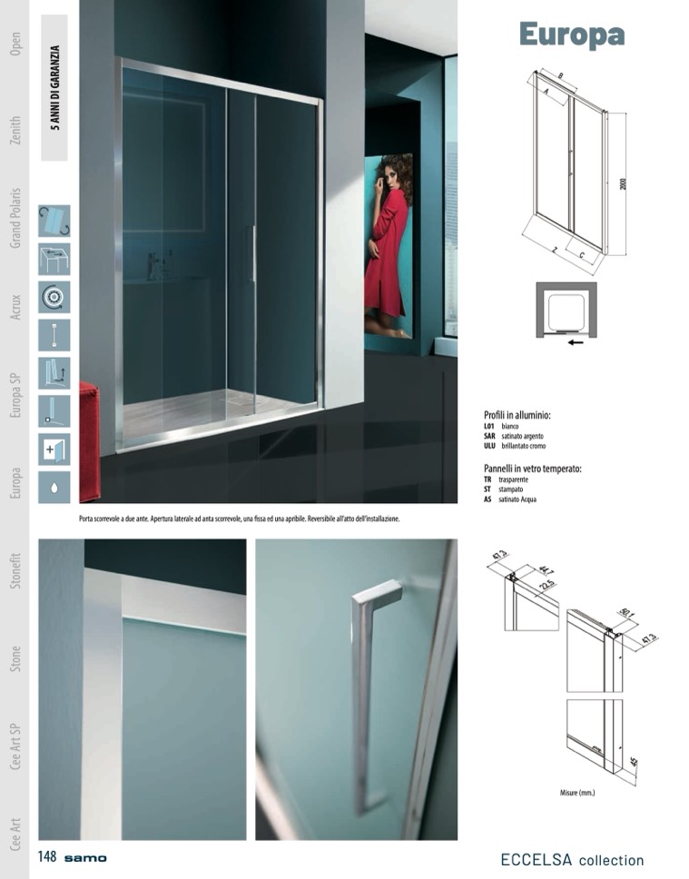 Porta scorrevole a due ante. Apertura laterale ad anta scorrevole, una fissa ed una apribile. Reversibile all’atto dell’installazione.