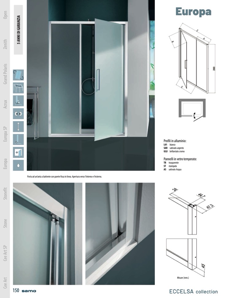 Porta ad un’anta a battente con parete fissa in linea. Apertura verso l’interno e l’esterno.