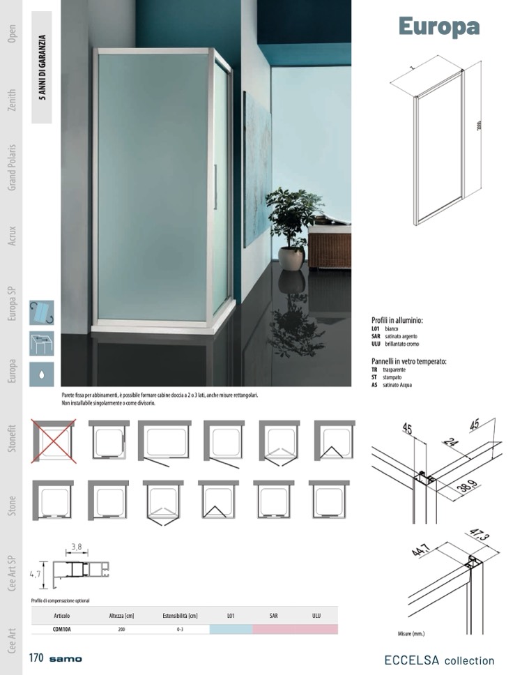 Parete fissa per abbinamenti, è possibile formare cabine doccia a 2 o 3 lati, anche misure rettangolari.