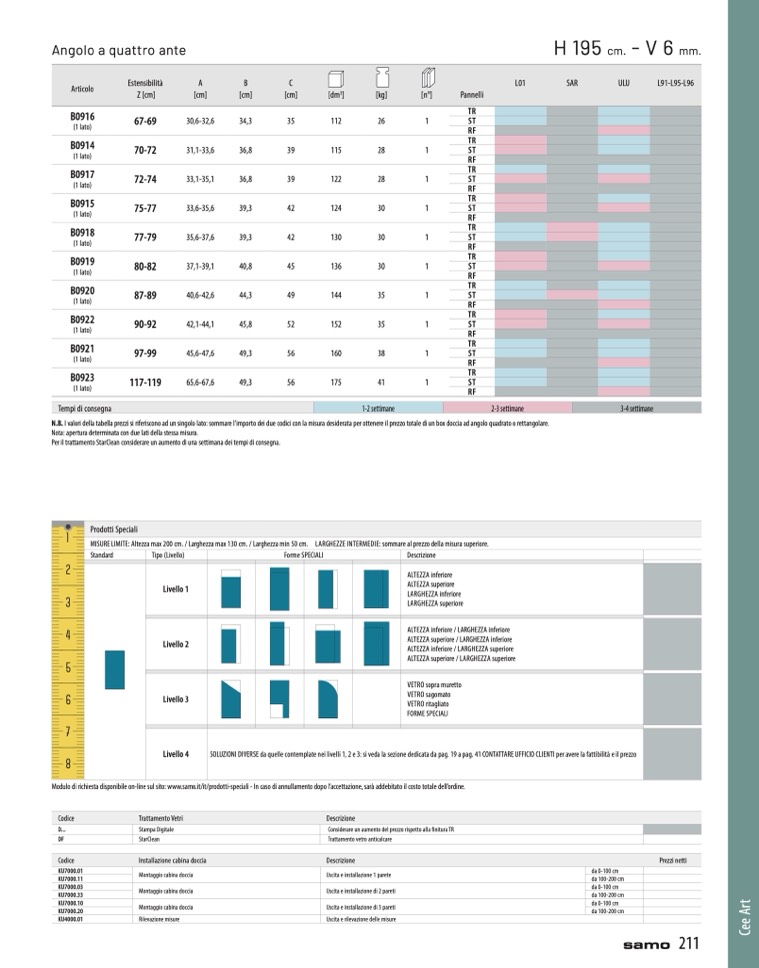 N.B. I valori della tabella prezzi si riferiscono ad un singolo lato: sommare l'importo dei due codici con la misura desiderata per ottenere il prezzo totale di un box doccia ad angolo quadrato o rettangolare.