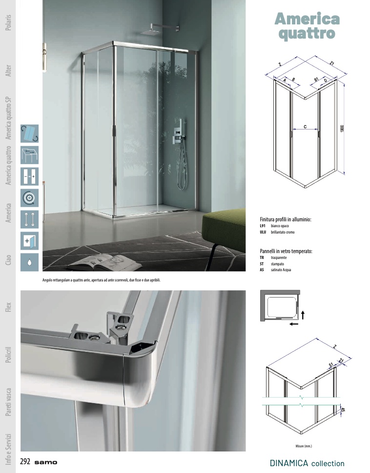 Angolo rettangolare a quattro ante, apertura ad ante scorrevoli, due fisse e due apribili.