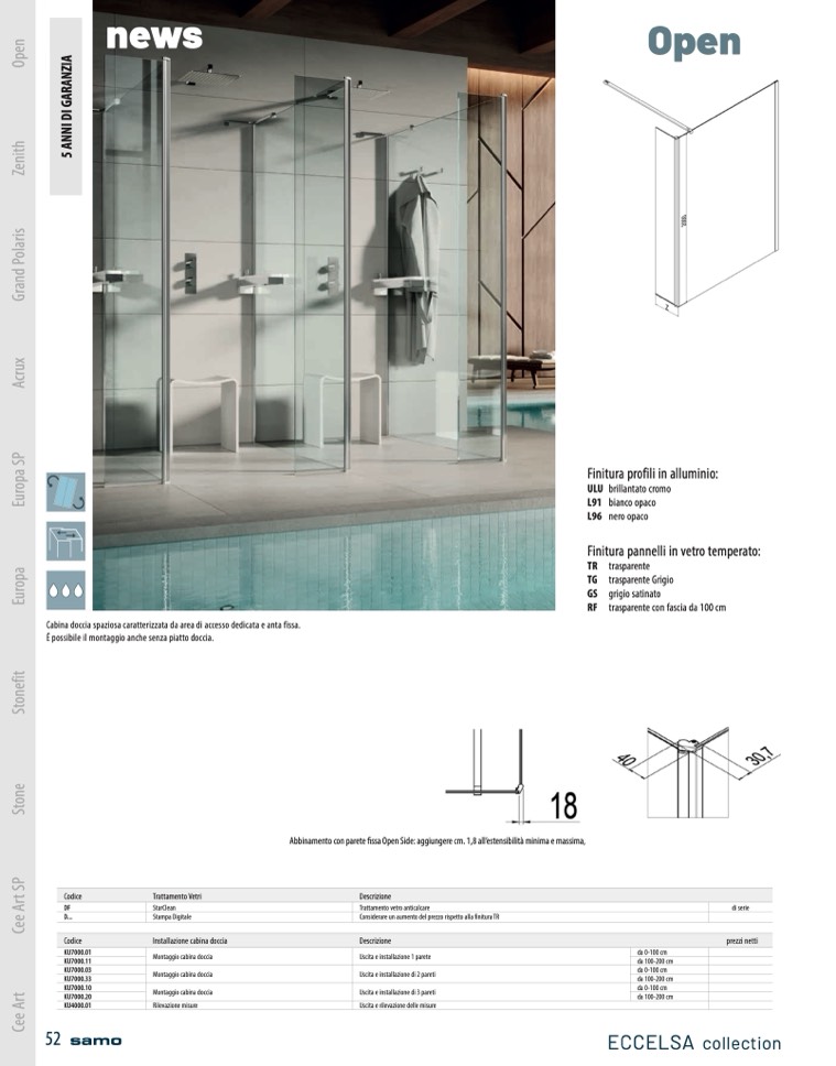Abbinamento con parete fissa Open Side: aggiungere cm. 1,8 all’estensibilità minima e massima,