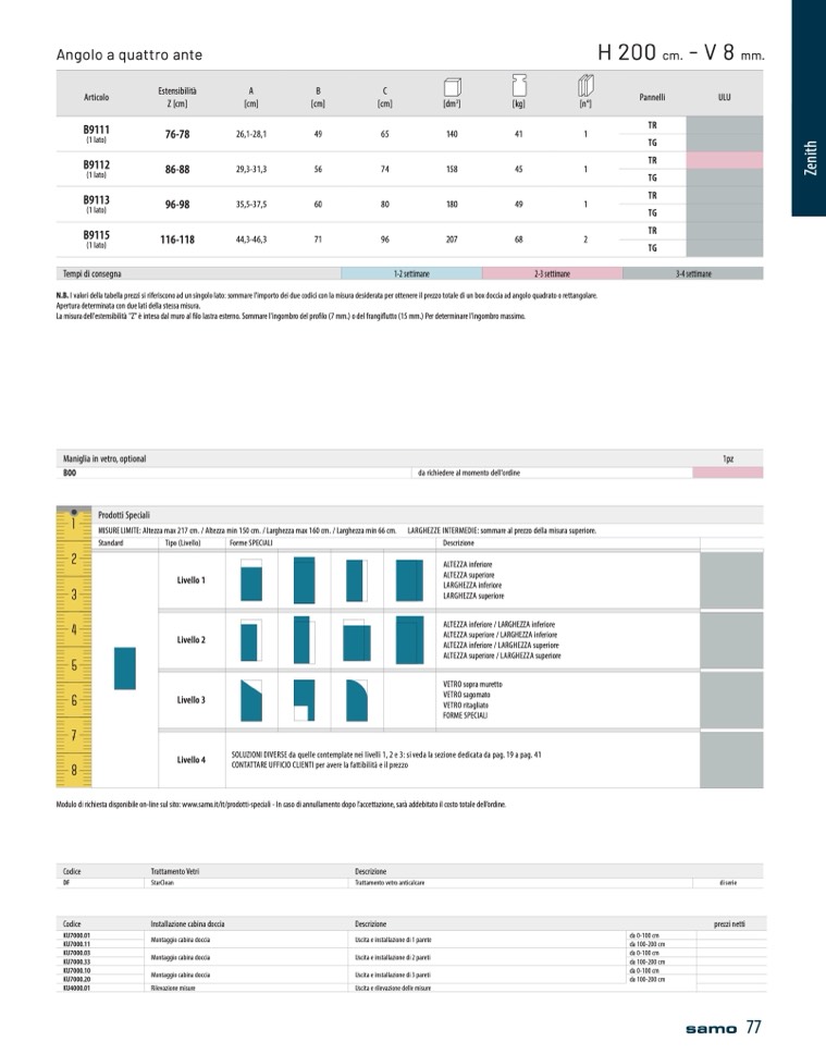 N.B. I valori della tabella prezzi si riferiscono ad un singolo lato: sommare l'importo dei due codici con la misura desiderata per ottenere il prezzo totale di un box doccia ad angolo quadrato o rettangolare.