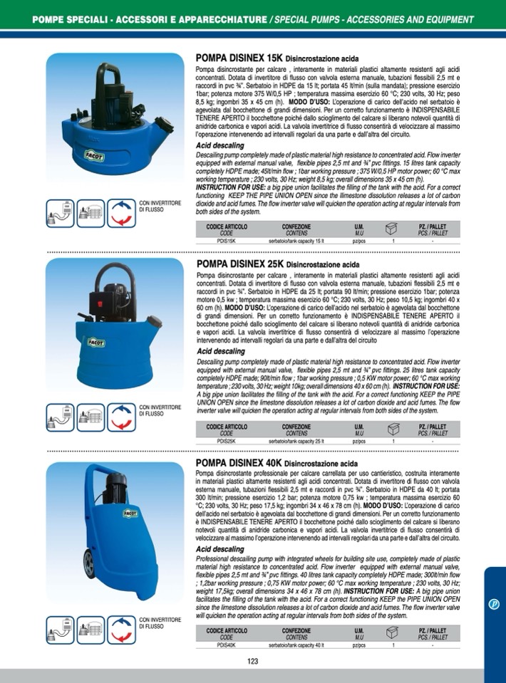 in materiali plastici altamente resistenti agli acidi concentrati. Dotata di invertitore di flusso con valvola