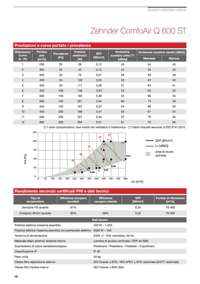(*) I valori comprendono i due motori dei ventilatori e l’elettronica - (**) Valori misurati secondo la ISO 3741:2010