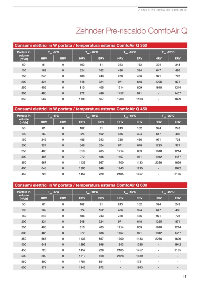 Consumi elettrici in W portata / temperatura esterna ComfoAir Q 600