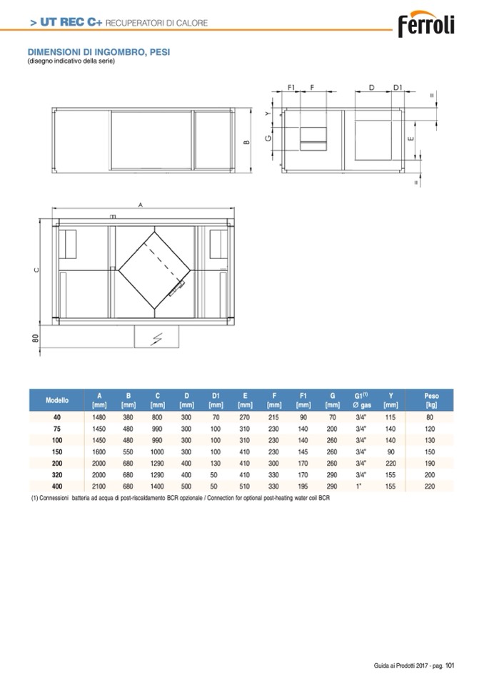 (1) Connessioni batteria ad acqua di post-riscaldamento BCR opzionale / Connection for optional post-heating water coil BCR