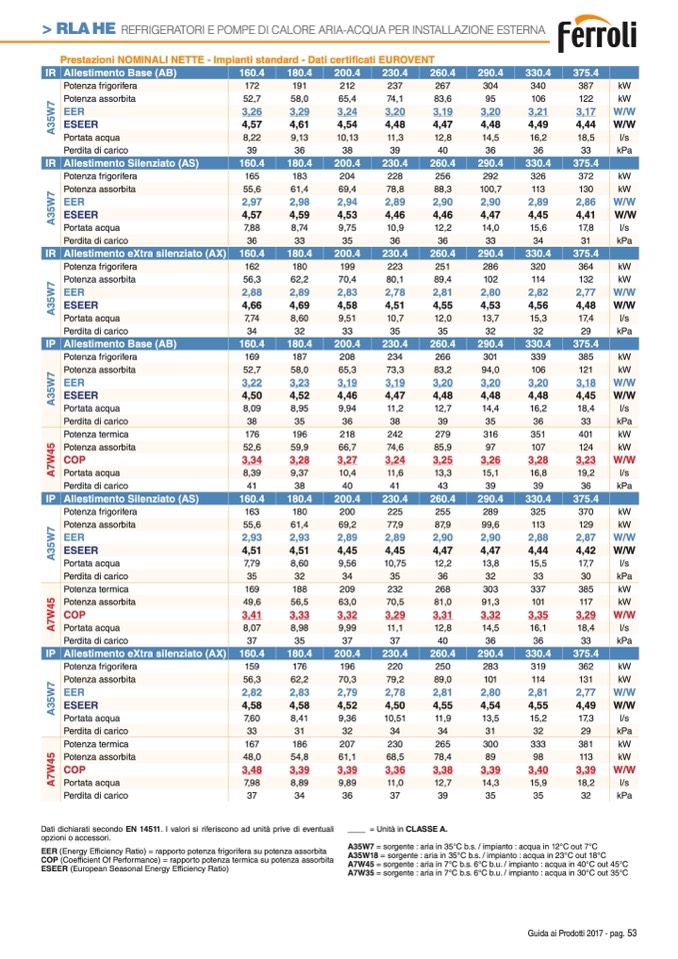 Prestazioni NOMINALI NETTE - Impianti standard - Dati certificati EUROVENT