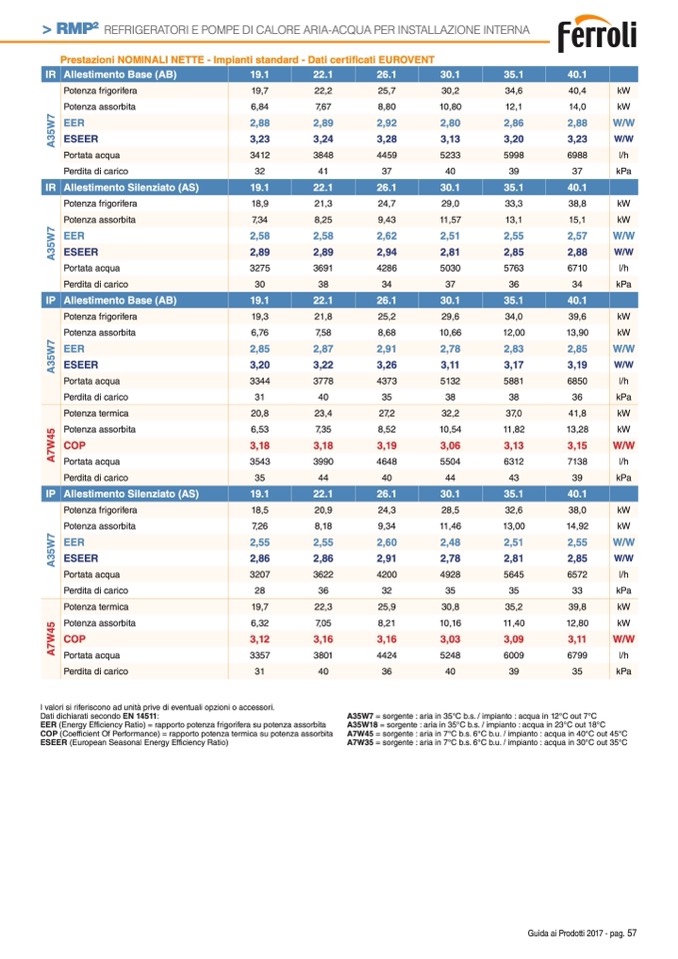 A7W35 = sorgente : aria in 7°C b.s. 6°C b.u. / impianto : acqua in 30°C out 35°C