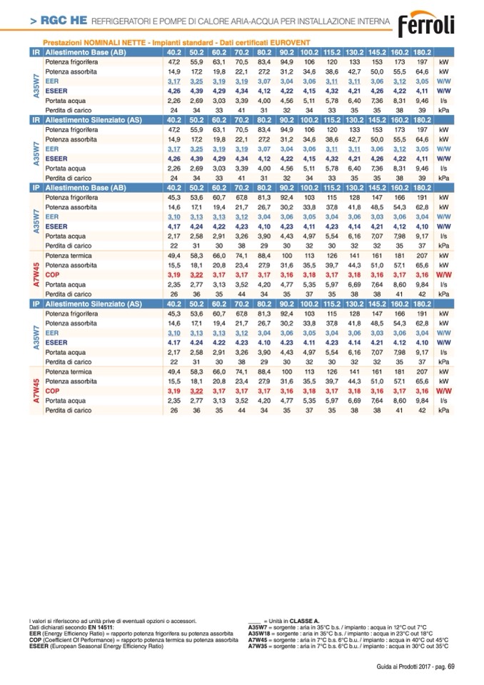 A7W35 = sorgente : aria in 7°C b.s. 6°C b.u. / impianto : acqua in 30°C out 35°C