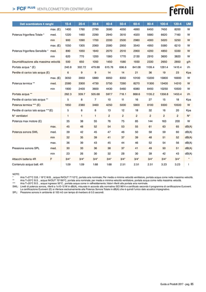 La certificazione Eurovent (E) si riferisce esclusivamente alla Potenza Sonora Totale in dB(A) che è quindi l’unico dato acustico impegnativo.