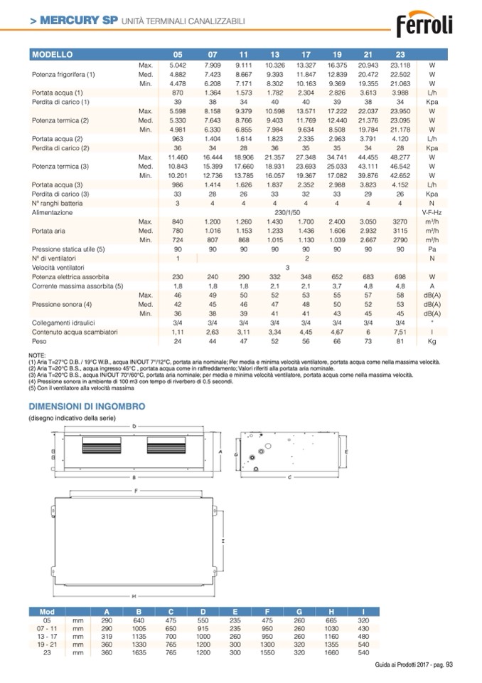(1) Aria T=27°C D.B. / 19°C W.B., acqua IN/OUT 7°/12°C, portata aria nominale; Per media e minima velocità ventilatore, portata acqua come nella massima velocità.