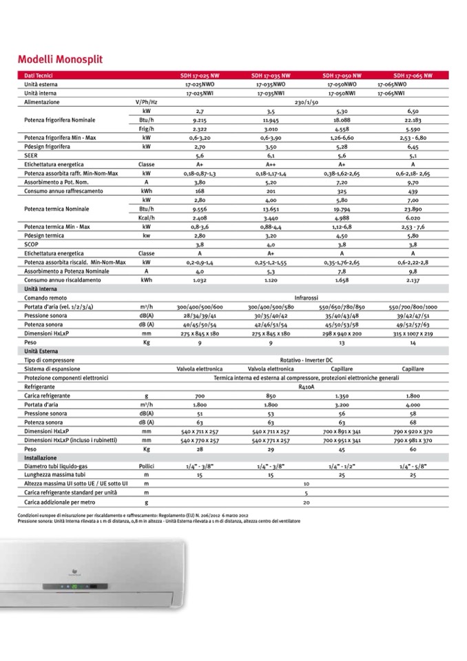 Pressione sonora: Unità Interna rilevata a 1 m di distanza, 0,8 m in altezza - Unità Esterna rilevata a 1 m di distanza, altezza centro del ventilatore