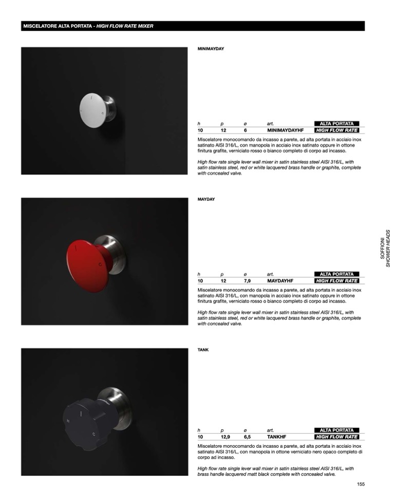 satinato AISI 316/L, con manopola in acciaio inox satinato oppure in ottone