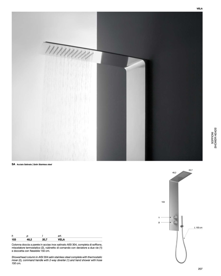 Showerhead column in AISI 304 satin stainless steel complete with thermostatic