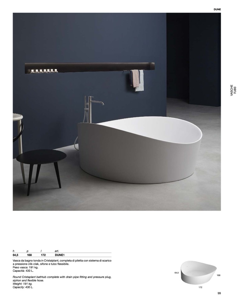 Vasca da bagno tonda in Cristalplant, completa di piletta con sistema di scarico