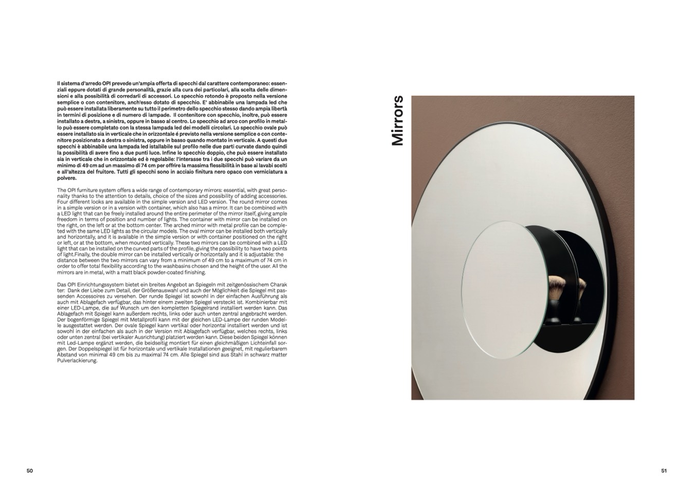 Il sistema d’arredo OPI prevede un’ampia offerta di specchi dal carattere contemporaneo: essen-