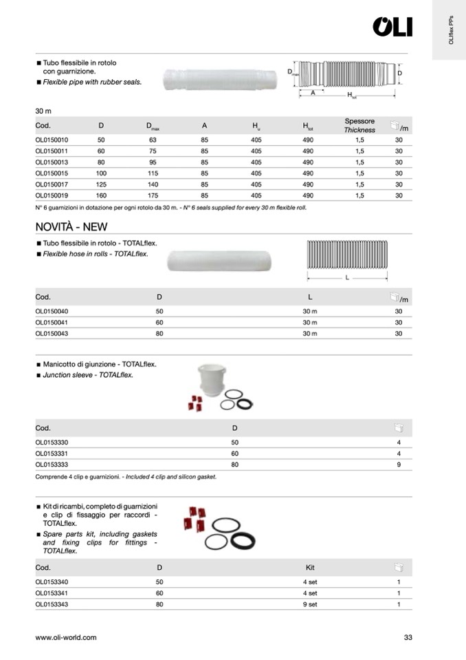 N° 6 guarnizioni in dotazione per ogni rotolo da 30 m. - N° 6 seals supplied for every 30 m flexible roll.