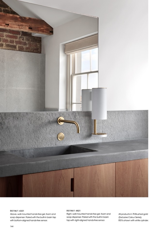 Above, wall-mounted hands-free gel, foam and