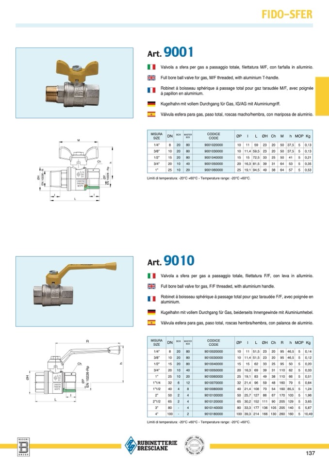 Valvola a sfera per gas a passaggio totale, filettatura M/F, con farfalla in alluminio