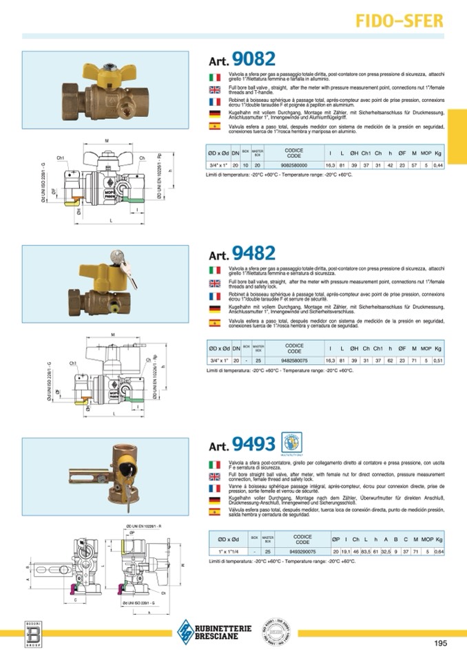 Valvola a sfera per gas a passaggio totale diritta, post-contatore con presa pressione di sicurezza, attacch