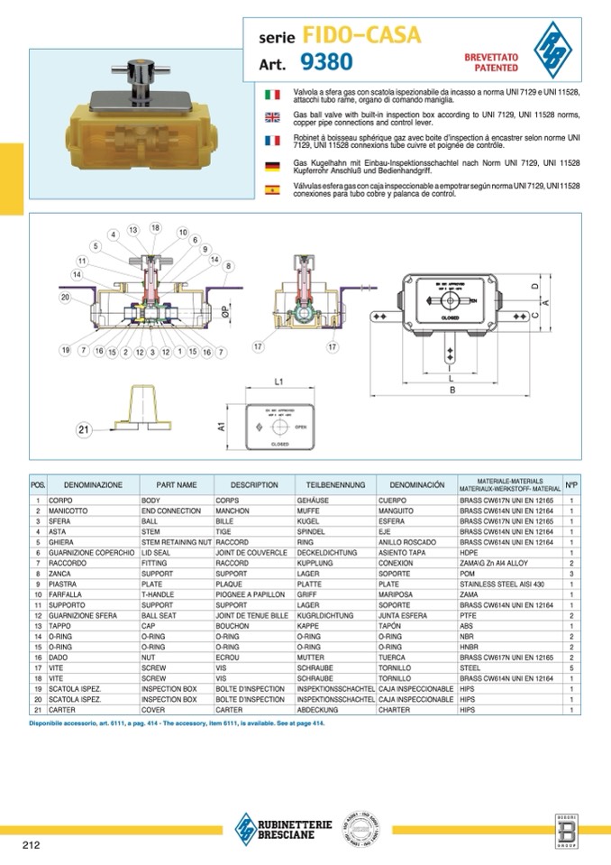 Valvola a sfera gas con scatola ispezionabile da incasso a norma UNI 7129 e UNI 11528,