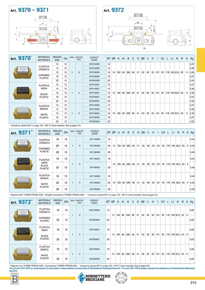 Per gli artt. 9371-9372 si raccomanda di consultare il responsabile commerciale di Rubinetterie Bresciane Bonomi - For artt. 9371-9372 please request the assistance of Rubinetterie Brescian