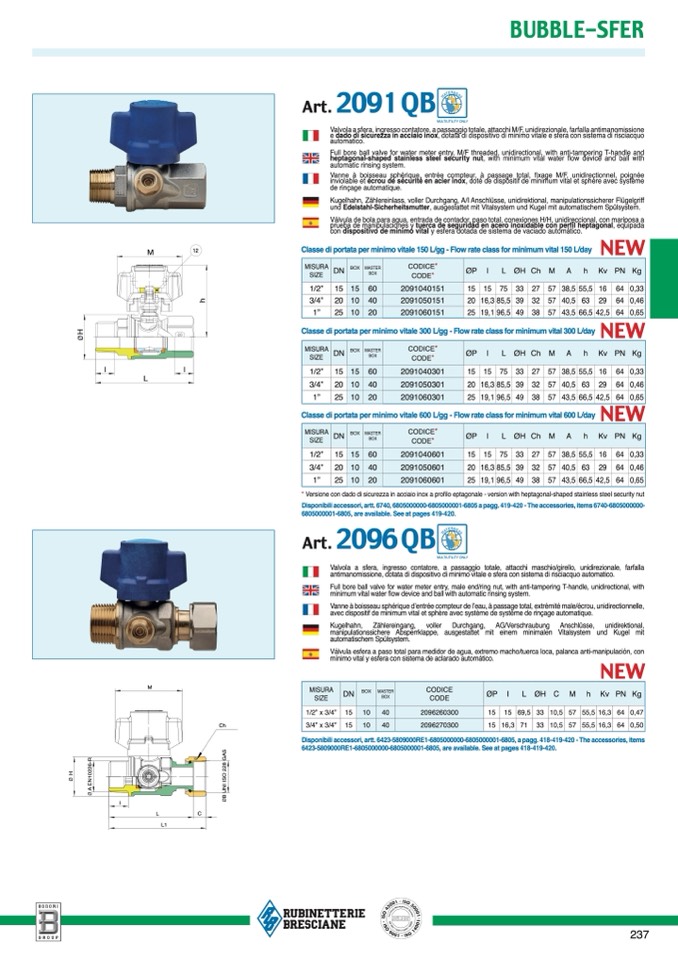 Valvola a sfera, ingresso contatore, a passaggio totale, attacchi M/F, unidirezionale, farfalla antimanomission