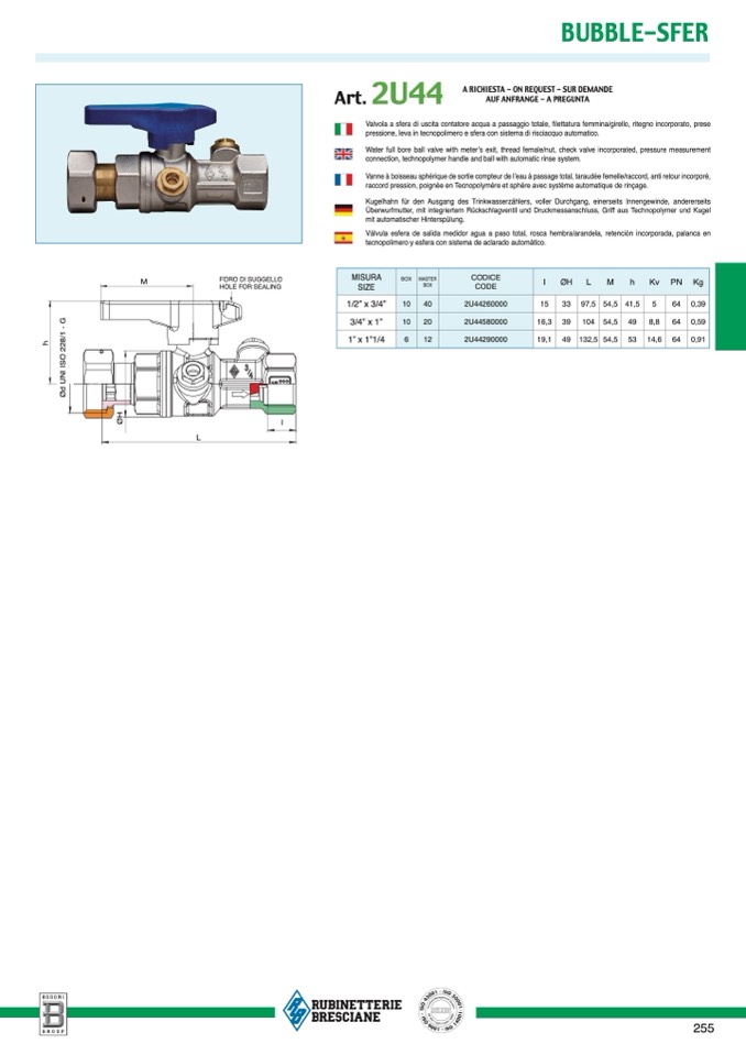 Valvola a sfera di uscita contatore acqua a passaggio totale, filettatura femmina/girello, ritegno incorporato, prese